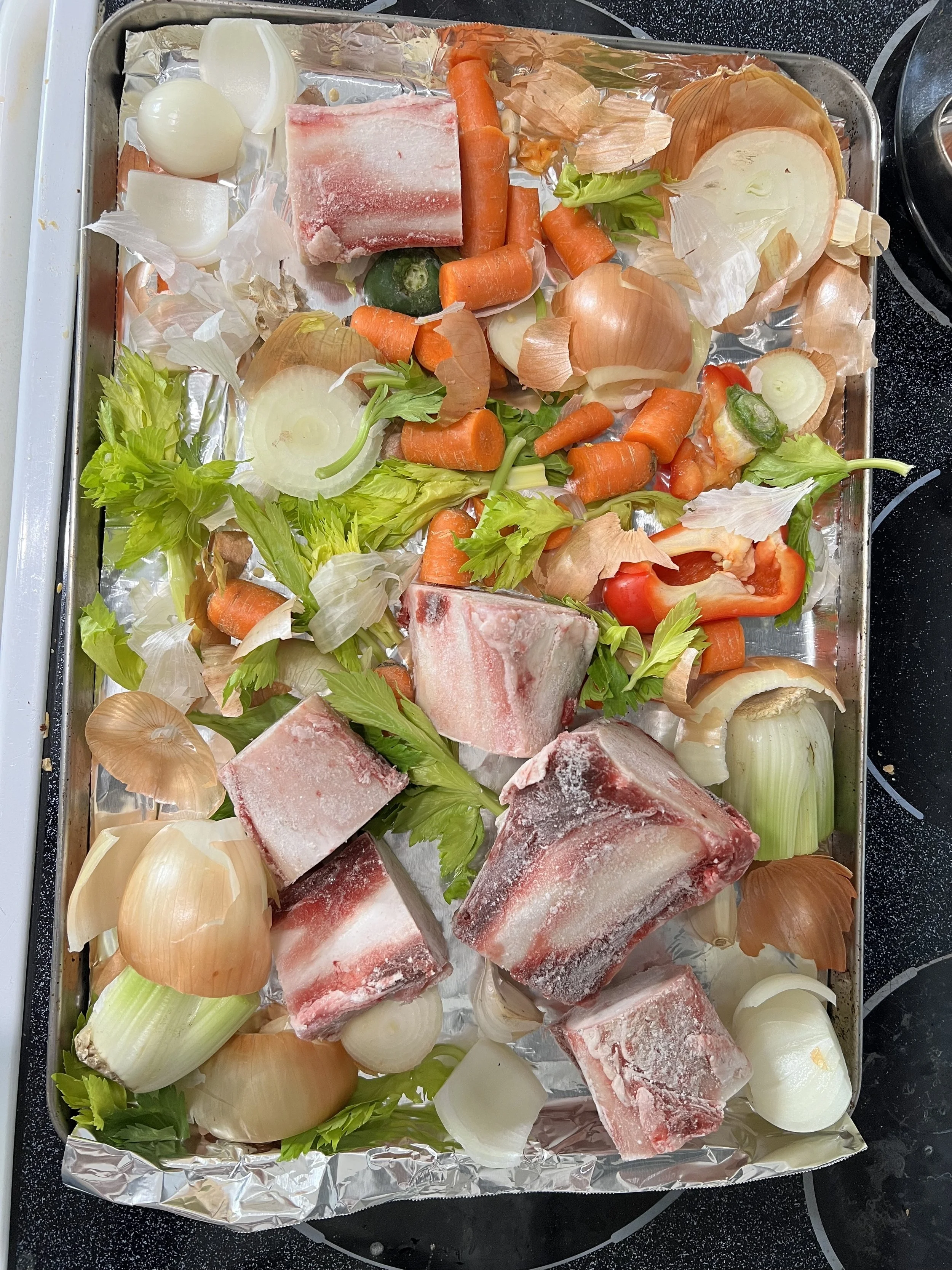 — Spread your beef bones and vegetable scraps in an even layer across the baking sheet. If you can’t get everything onto one sheet, it’s okay to use two.