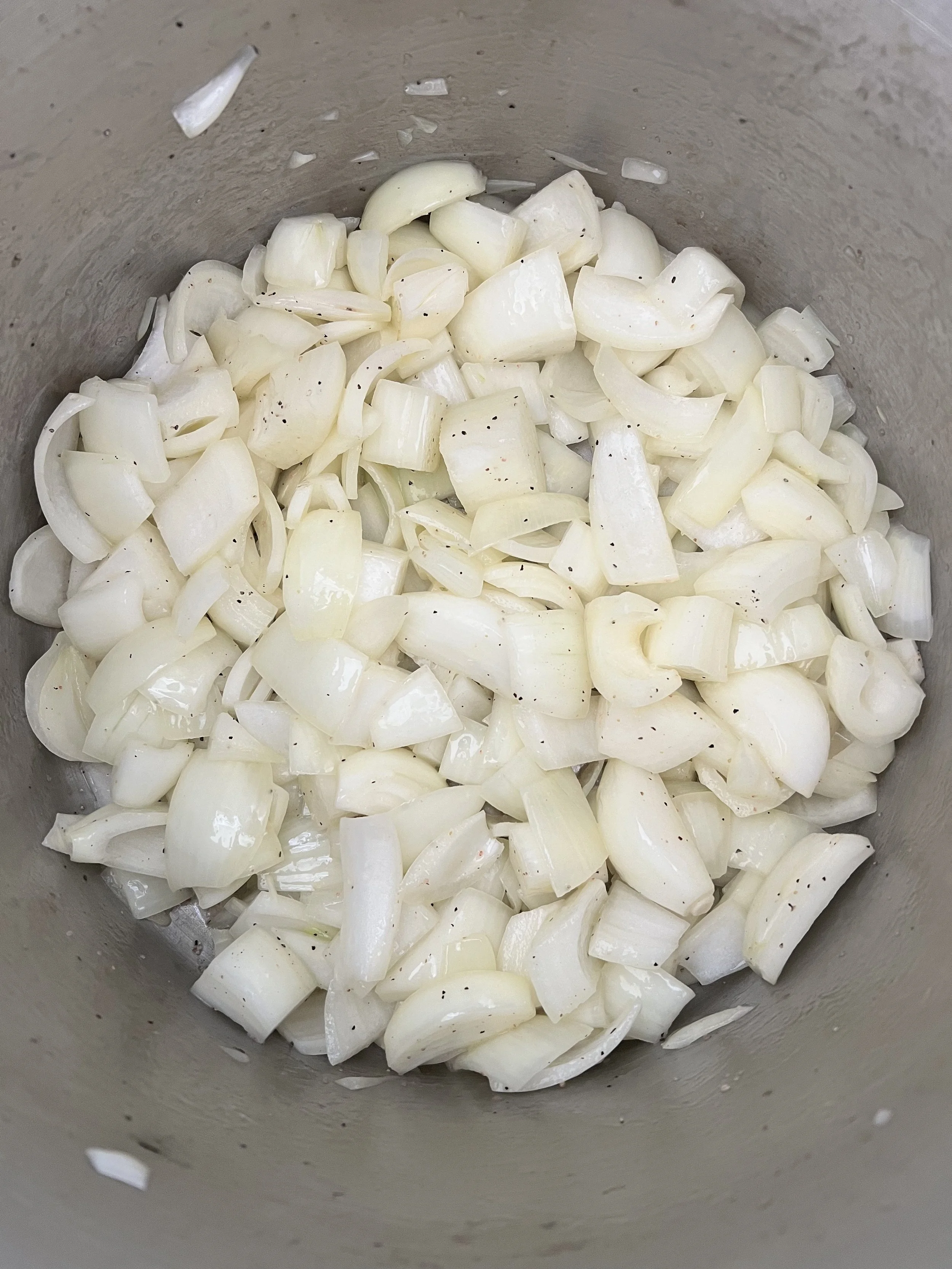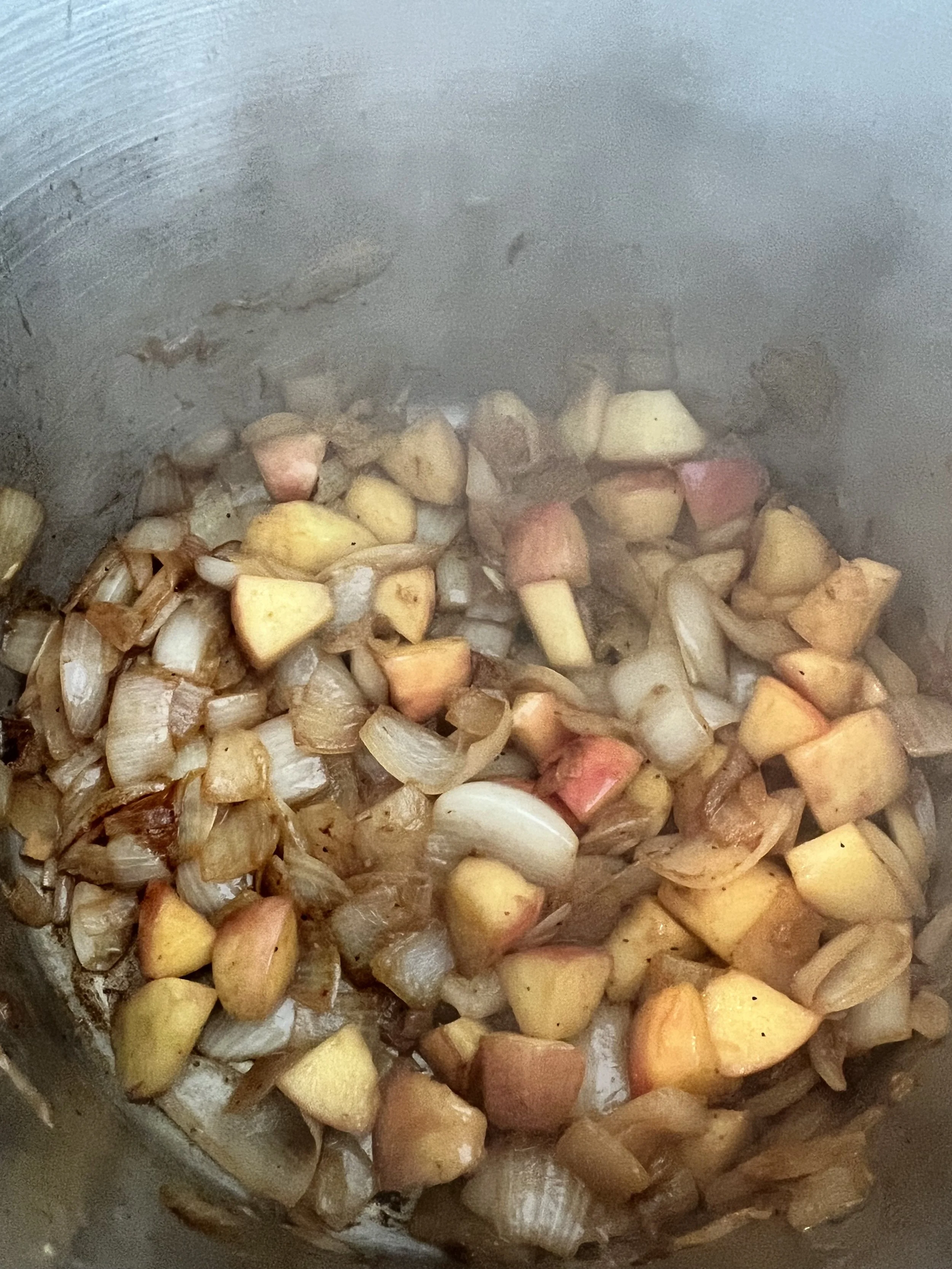 — Add onions to the pot, sprinkle generously with salt and pepper. Cook on medium-high until browned, about 20-30 minutes. Stir frequently to ensure good coloring all of the onion pieces. Add the apples in about halfway through.