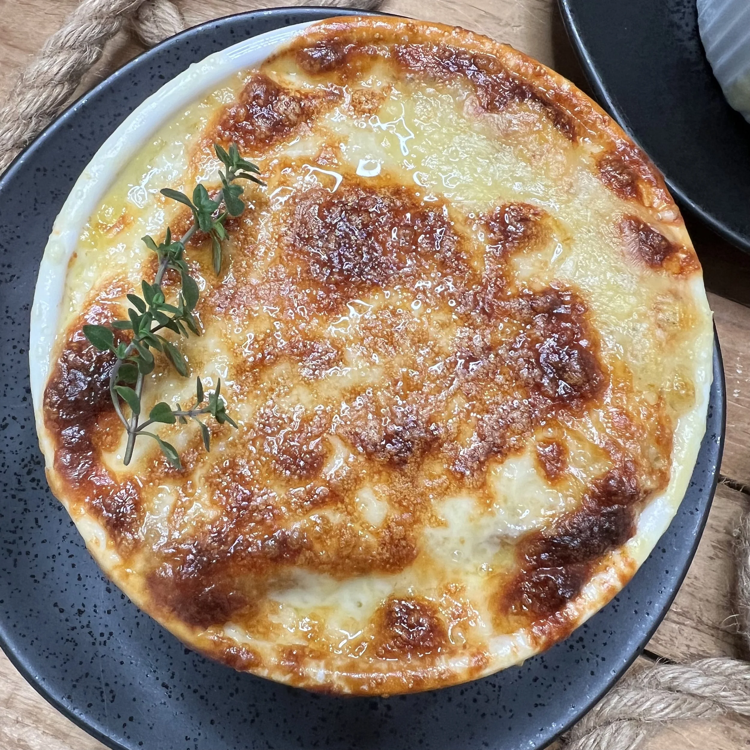 — Place each crock in the oven, close to the broiler, and close the door. Let the cheese become molten, drip, bubble, brown, and even burn in a couple places. Let the broiler work until the cheese has a rich, beautiful color and texture, then carefully— carefully, with very thick oven mitts— pull the crocks out and put each one on its own serving plate.