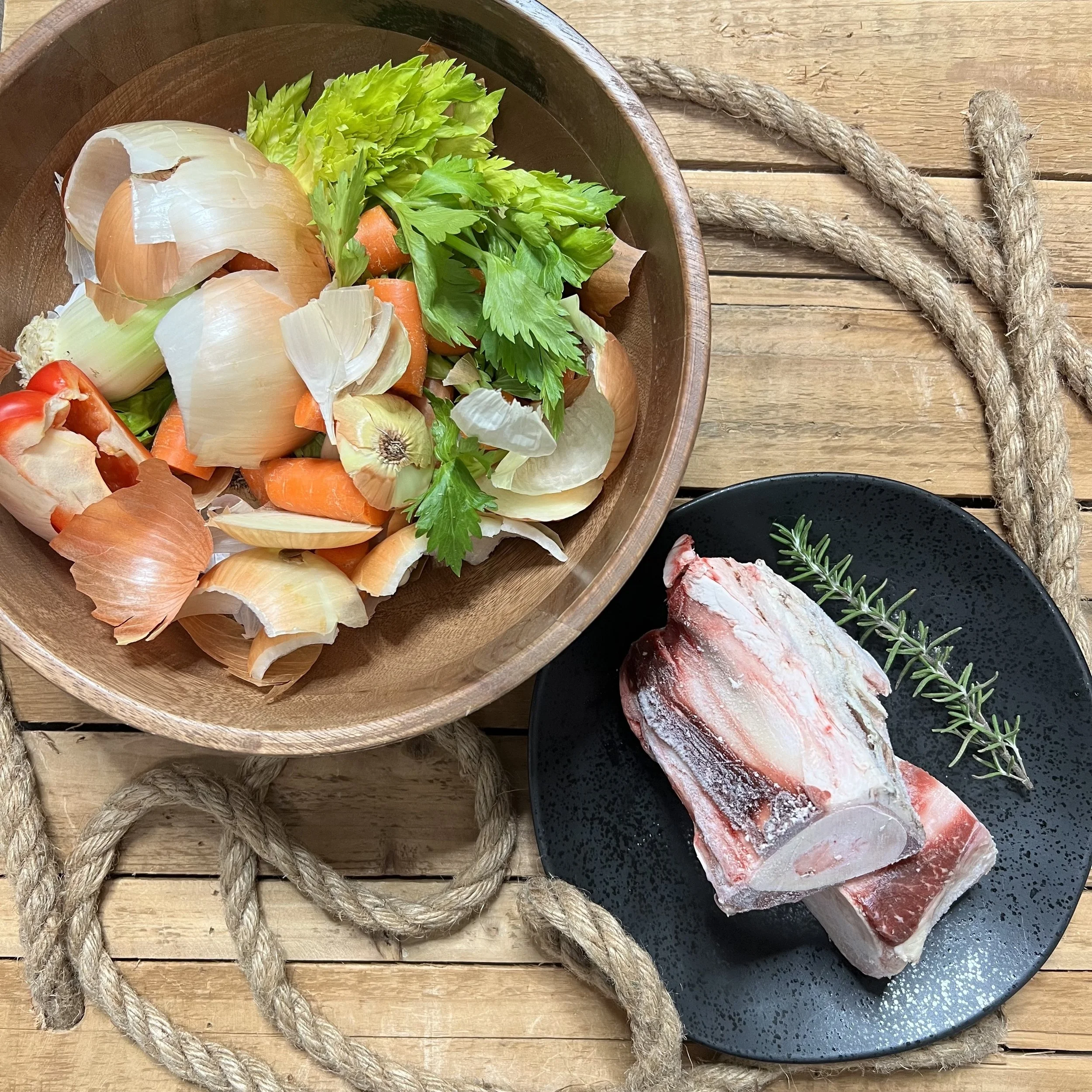 So, why are we saving and reusing scraps? One, you’ve already paid for them, so you’re saving money by not going out and buying a fresh bag of carrots to make this recipe. And two, by being resourceful you’re decreasing the amount of food waste you produce, so you’re helping out your wallet and the planet at the same time. While we’re using store-bought beef bones for this recipe, keep in mind that you can apply the same principles to meat scraps: save your turkey carcass after Thanksgiving dinner, hold onto ham bones too.